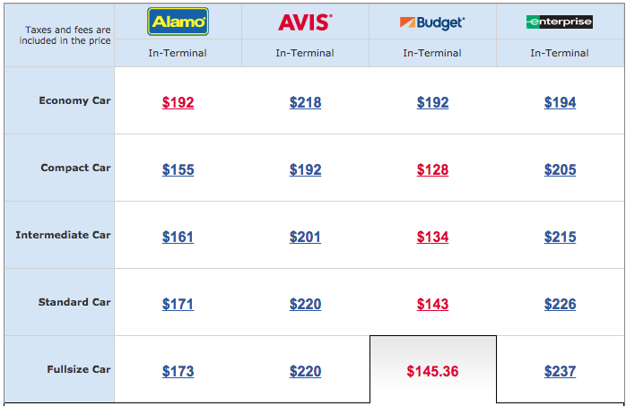 We discuss In our article on Save At Walt Disney World we discuss ways to save on rental cars in Orlando and that Costco has has consistently had the lowest rates. The same is true for Aprile 2015. We research the major travel websites: Travelocity, Expedia, Priceline, Hotwire, Orbitz and BJ's Wholesale. All showed above-average rates. Here's a look at what we found in our research for dates April 11 through April 18, 2015 (7-day nights):