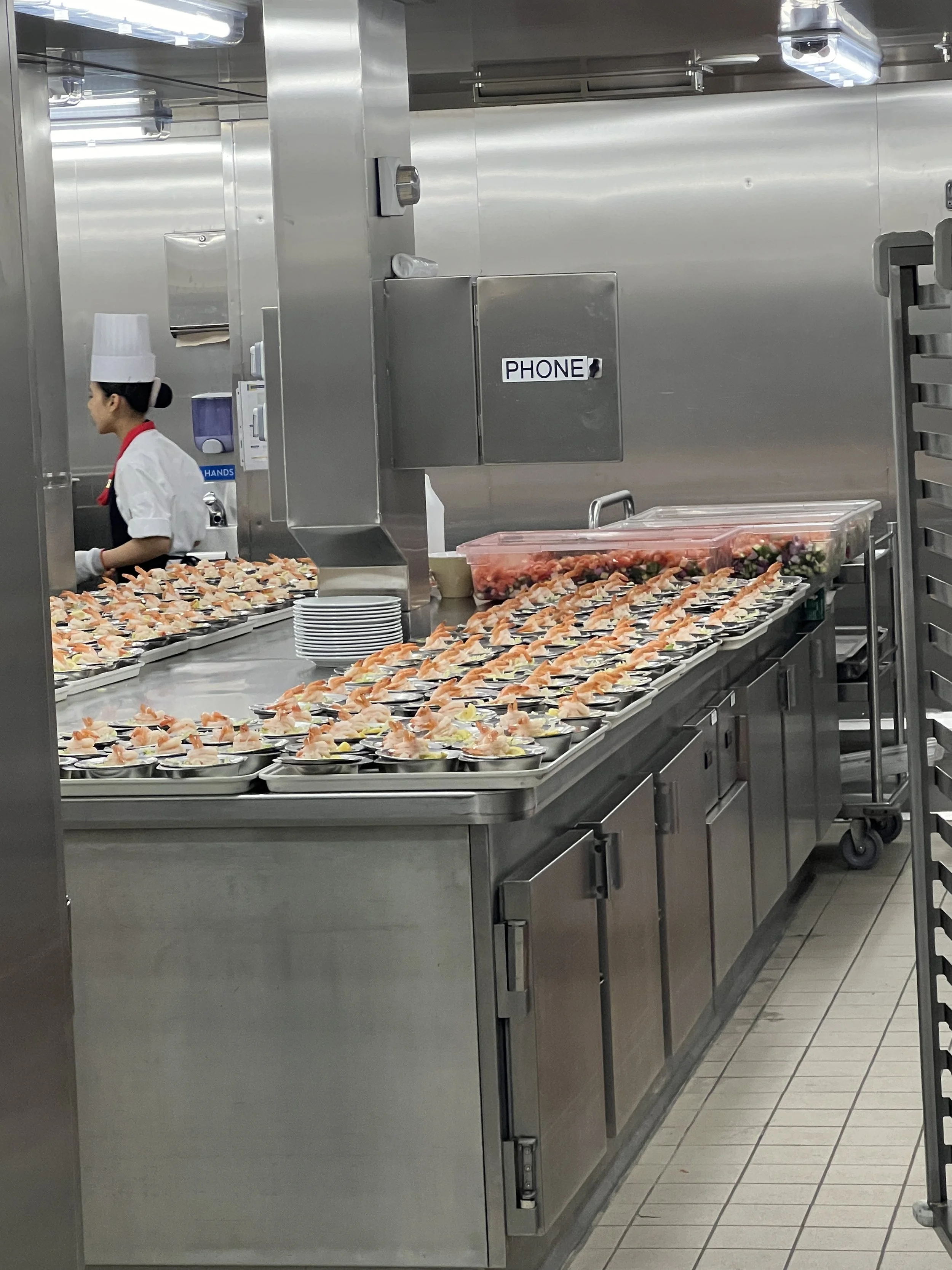 The kitchens operate 24 hours a day, with 3 shifts doing everything from food prep, cooking, to baking and clean up.