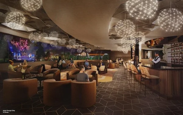 Guests can enjoy sweeping views of the World Celebration Gardens, offering a breathtaking perspective of EPCOT's vibrant landscapes and attractions. As the sun sets and the park transforms for the evening, the lounge becomes the perfect setting to experience the nightly fireworks from an entirely new angle.