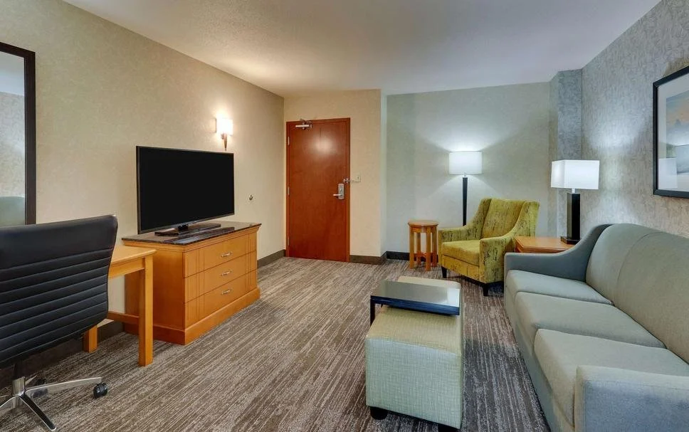 Family Suite - sleeps between 4-6 people. Suites have two spacious rooms separated by a door. They come with either 2 queen beds (sleeps 6) or 1 king bed (sleeps 4) in the main bedroom and a pull-out queen sofa sleeper in the living room.